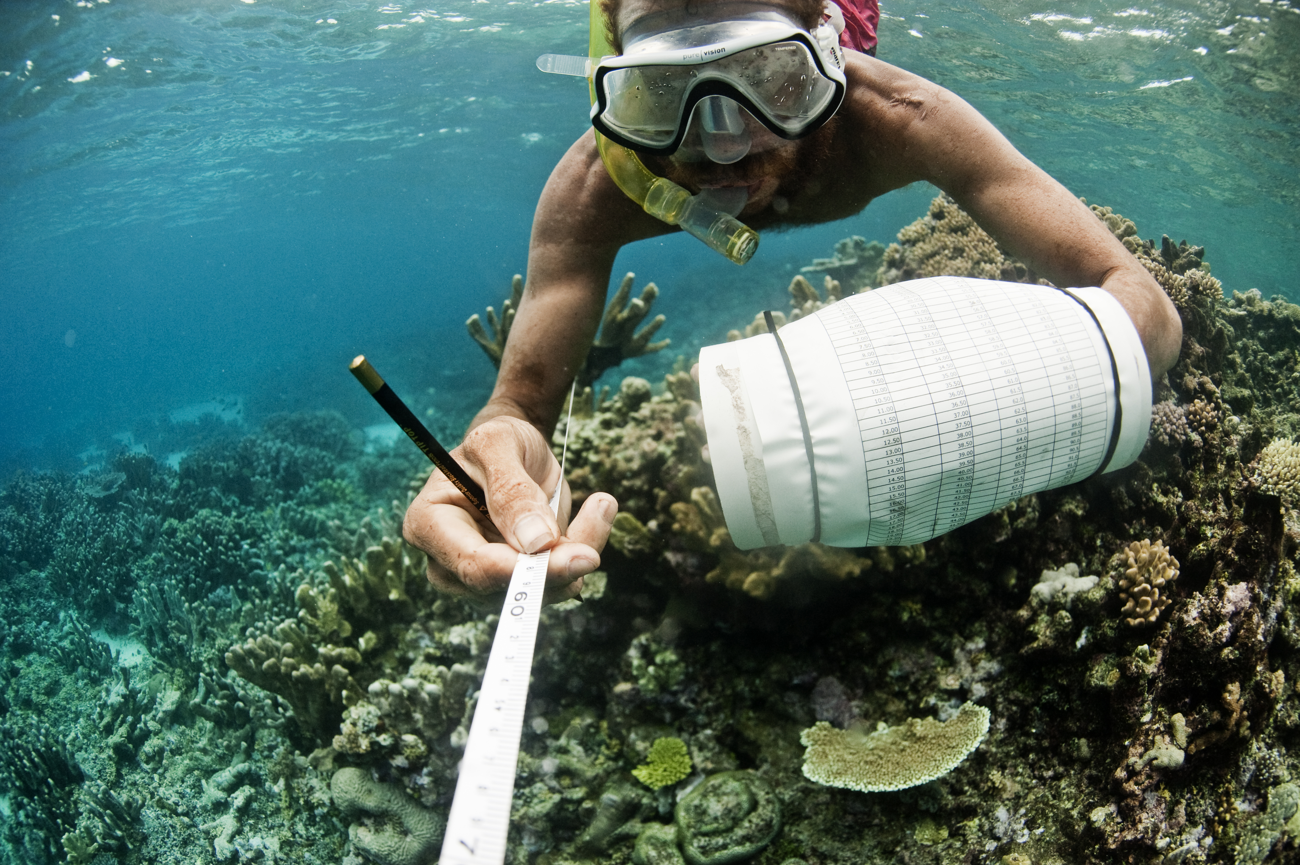 Simeon conducts a reef transect in the Marine Protected Area in Nuakata, Milne Bay Province, Papua New Guinea