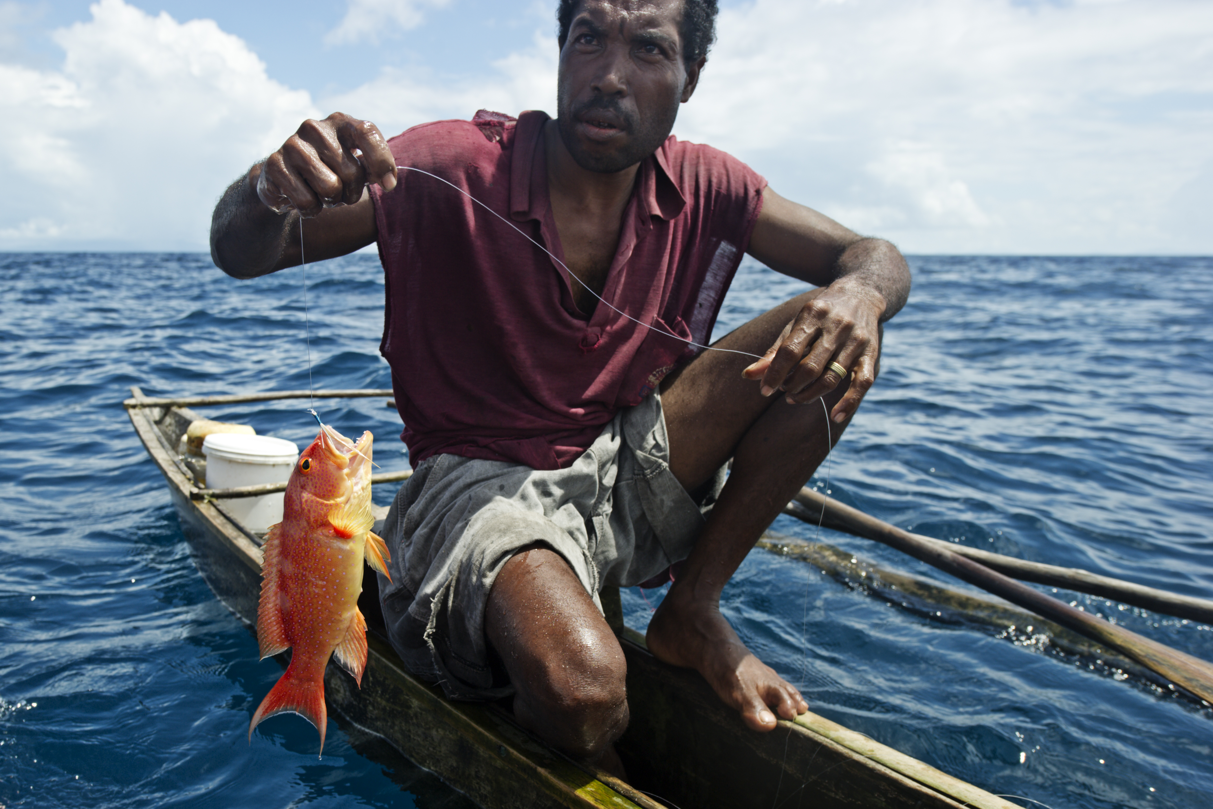 A fisherman demonstrates his catch using only the simple tools of a dugout canoe and fishing line. Papua New Guinea's geographically and culturally dispersed communities make a one-size-fits-all approach to coastal and marine management difficult. Instead, a system of Locally-Managed Marine Areas draw upon communities to manage their own resources.