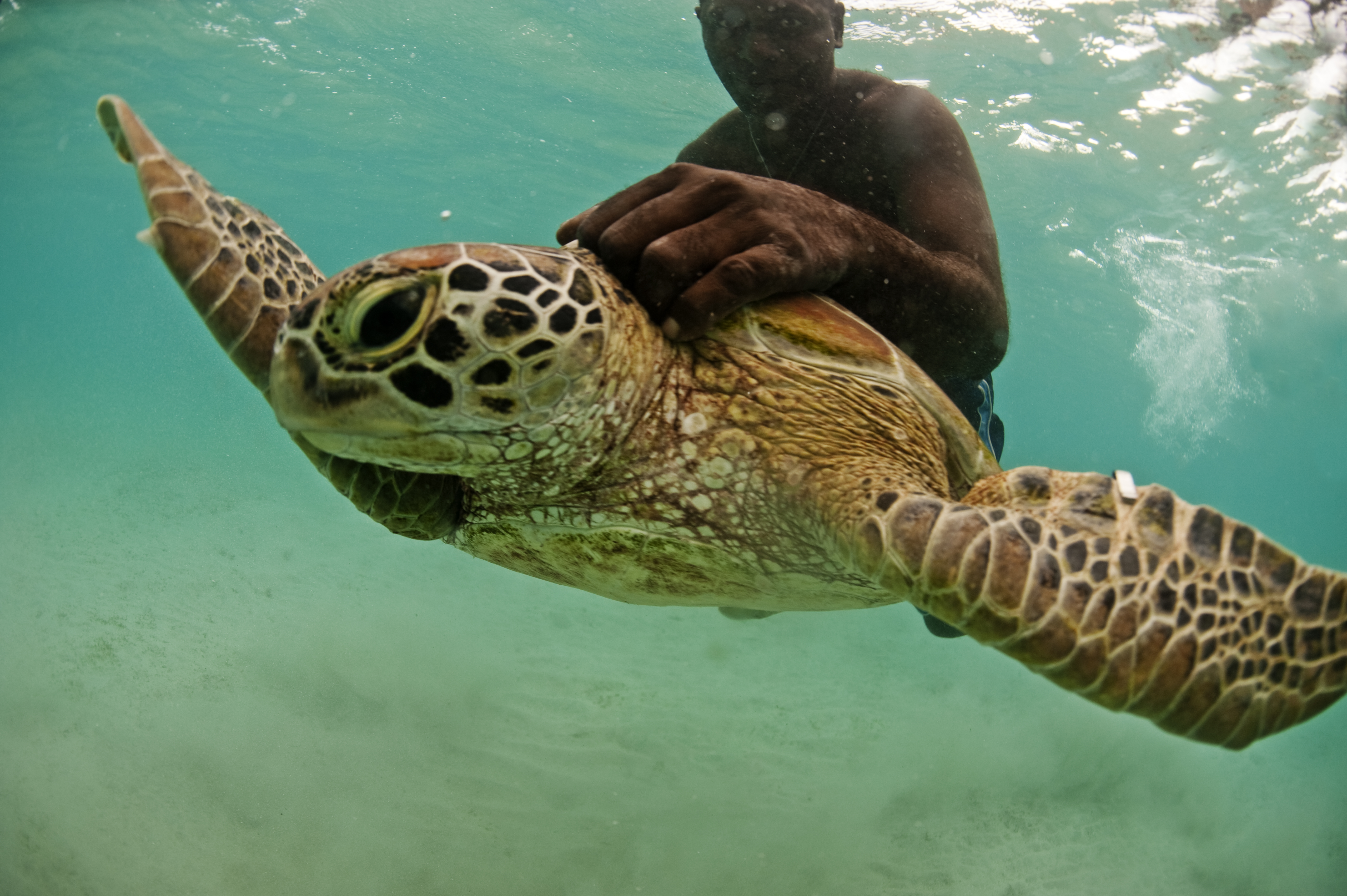 A local ranger at Tetepare captures a Hawsbill turtle, as part of montoring and tagging activities in the area, where this species is endangered